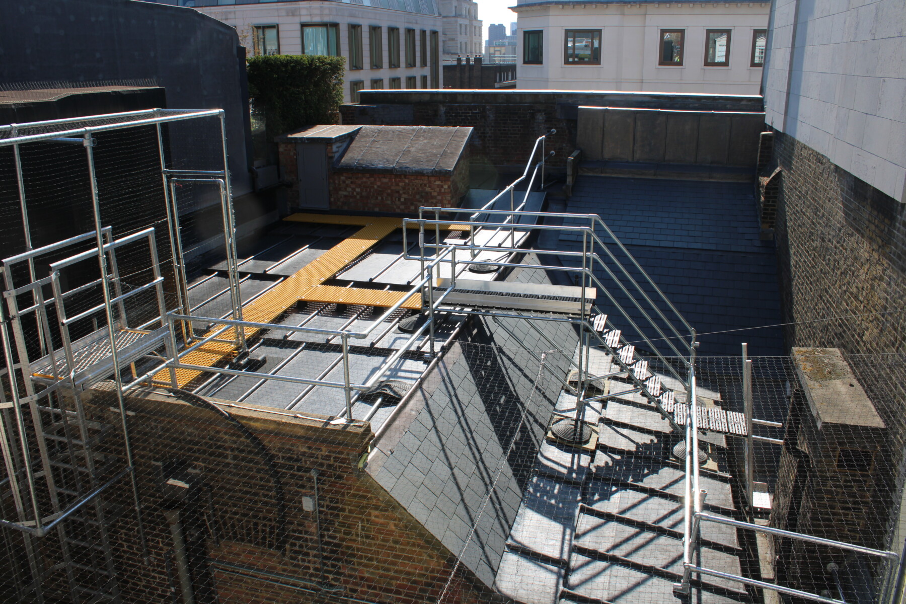 Works included replacement of perished lead coverings with new Code 5 lead on upgraded substrates, installation of new lead valleys and gutters, replacement of failed slate with Welsh slate, and renewal of the upper roof using a seamless Sika GRP system. Roof access was improved through the removal of cast-iron cat ladders and installation of aluminium safety-hooped ladders, GRP walkways, and up-and-over stair access.