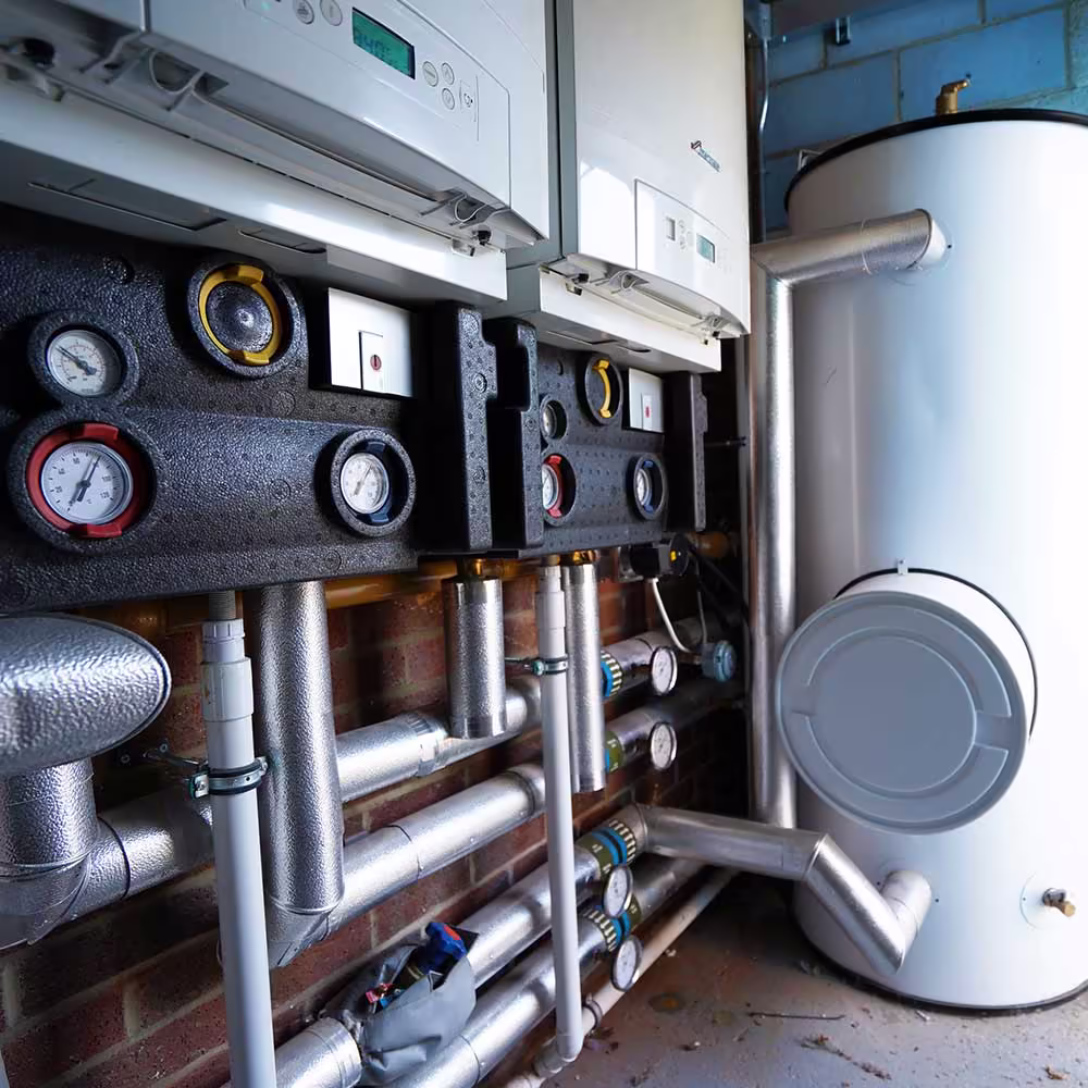 A close-up of a newly installed commercial hot water and heating system, highlighting the pressure gauges, insulated pipework, and hot water cylinder.