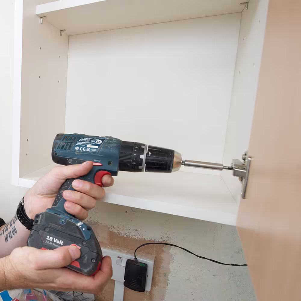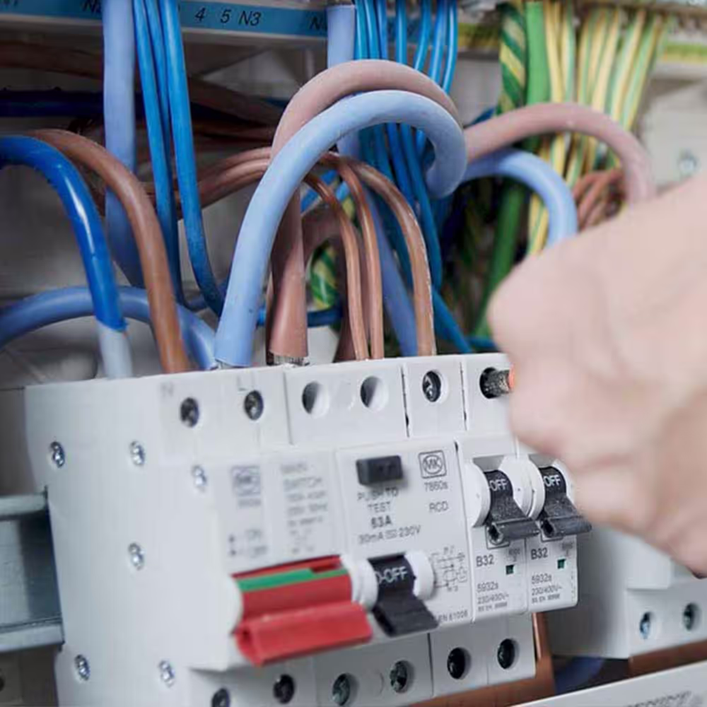 Close-up of a qualified electrician's hands performing safety checks and wiring on a domestic consumer unit for housing compliance services.