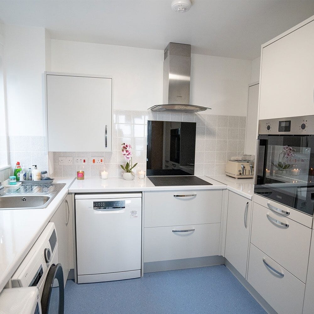 Each wet room’s specifications were customized based on residents’ needs determined by OT reports, ensuring accessibility. This included features such as extended hose lengths, shower seats with backrests, wet floors, curtains, cubicle doors, and screens. Kitchen unit installations varied per resident, featuring cupboards, worktops, waterfall edges, self-closing hinges, heat-resistant shelves, electric hobs, slip-resistant flooring, and handrails.