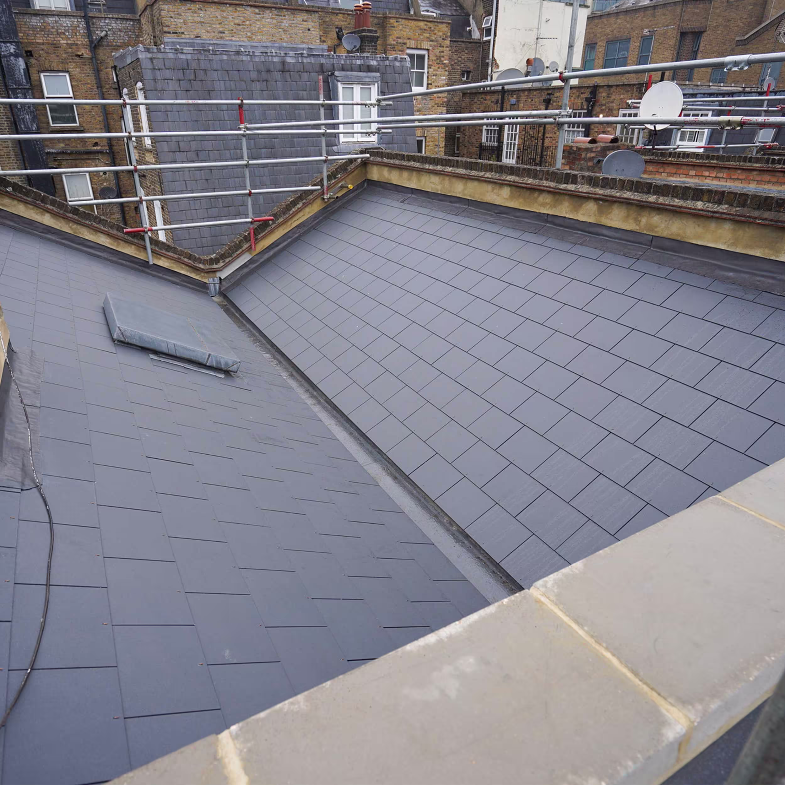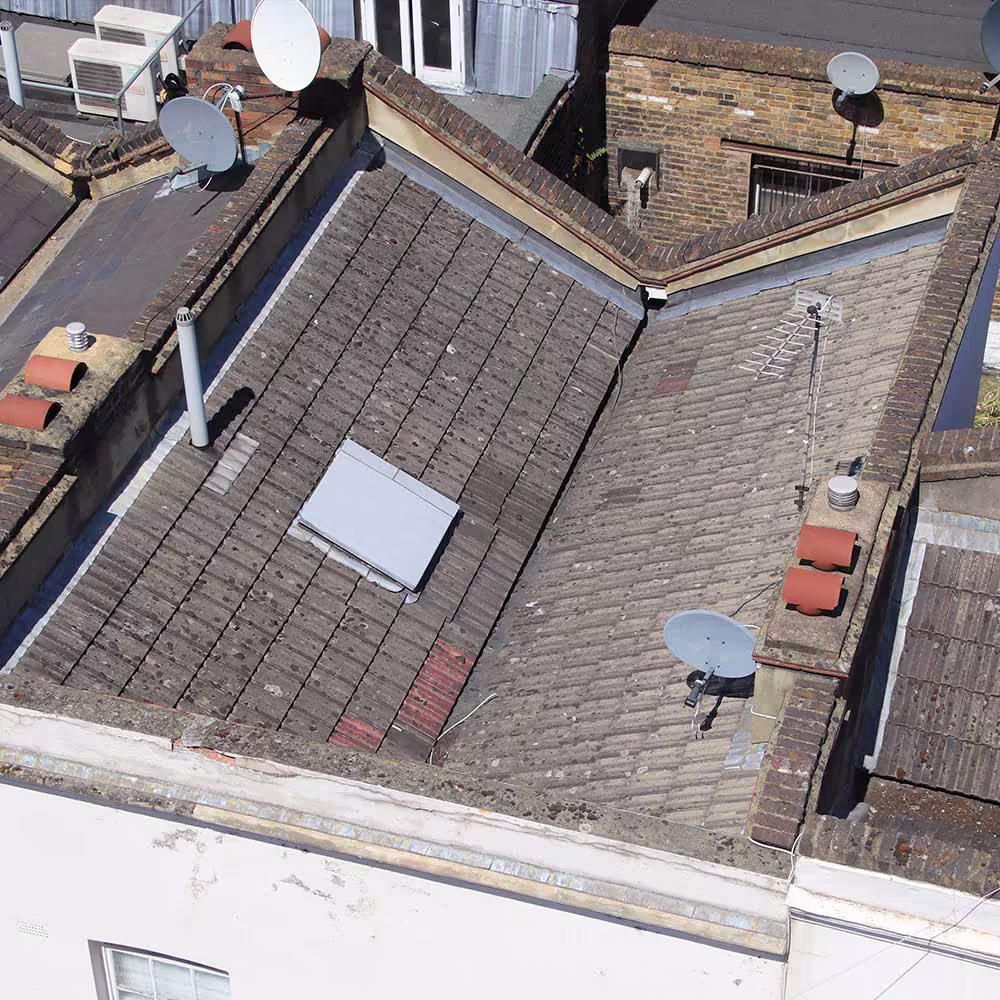Our extensive external refurbishment programme included roof works. Our team removed composite cement and concrete interlocking tiles as well as associated flashing. We also carried out pointing and added natural slate and fibre cement tiles. The team installed new felt, battens and associated flashings and valleys.