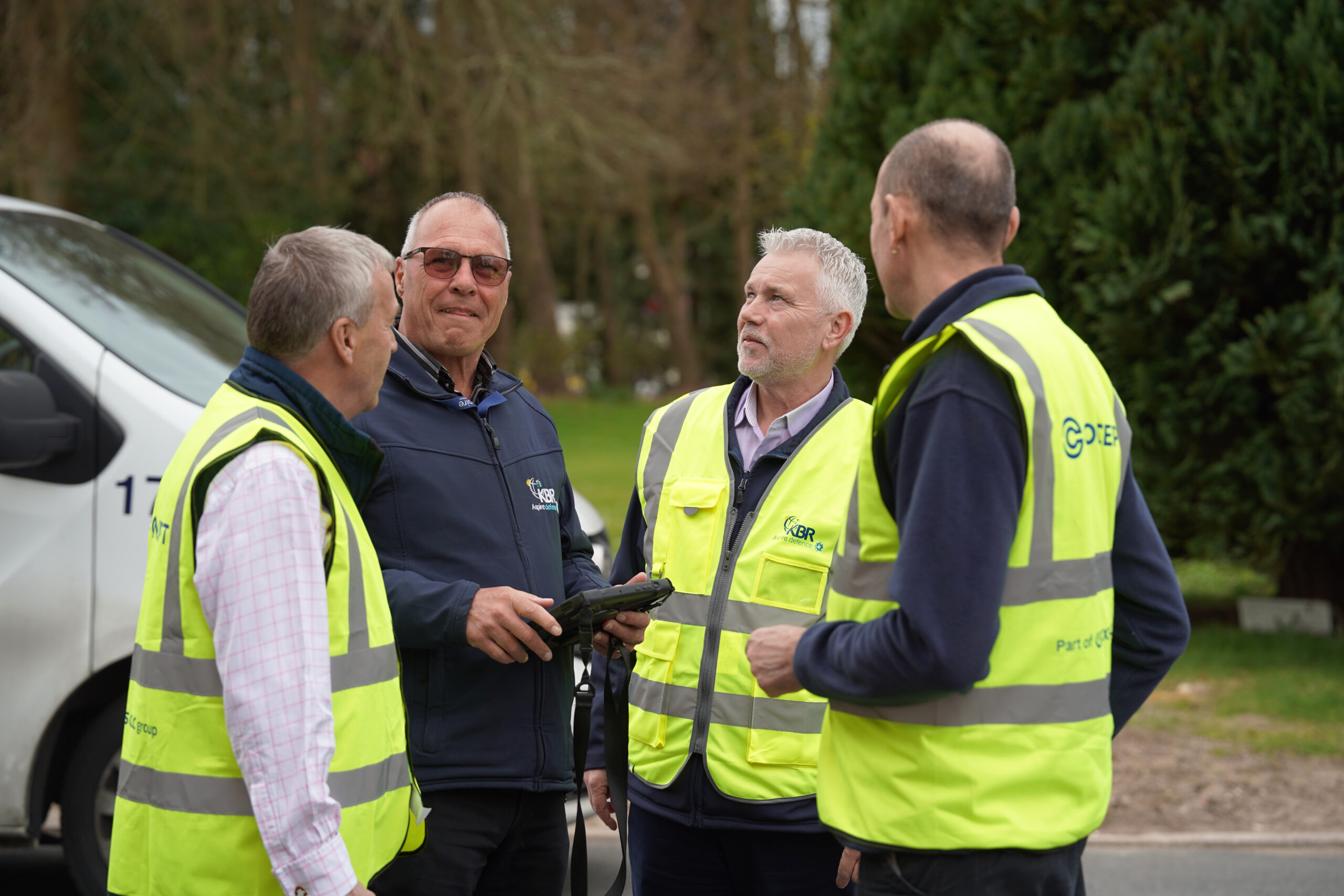 CLC in high vis operative outside social housing property white fleet van with blue logo icon